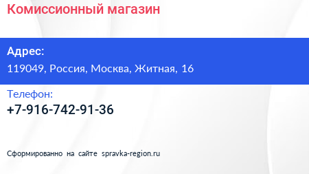 Комиссионный магазин по адресу 119049, Россия, Москва, Житная, 16 в дальнейшем Организация, размещена в следующих категориях: