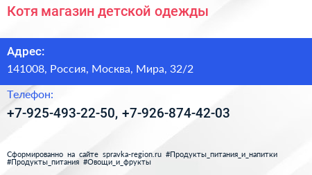 Котя, магазин детской одежды по адресу 141008, Россия, Москва, Мира, 32/2 в дальнейшем Организация, размещена в следующих категориях:
