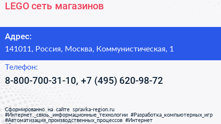 LEGO, сеть магазинов по адресу 141011, Россия, Москва, Коммунистическая, 1 в дальнейшем Организация, размещена в следующих категориях: