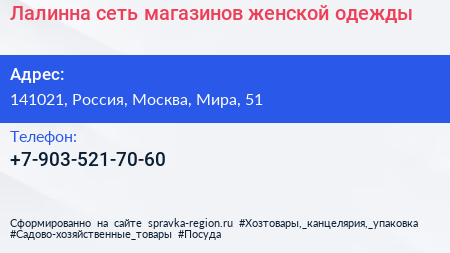 Лалинна, сеть магазинов женской одежды по адресу 141021, Россия, Москва, Мира, 51 в дальнейшем Организация, размещена в следующих категориях: