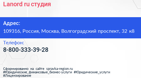Lanord.ru, студия по адресу 109316, Россия, Москва, Волгоградский проспект, 32 к8 в дальнейшем Организация, размещена в следующих категориях: