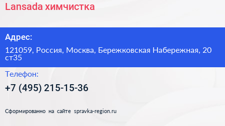 Lansada, химчистка по адресу 121059, Россия, Москва, Бережковская Набережная, 20 ст35 в дальнейшем Организация, размещена в следующих категориях: