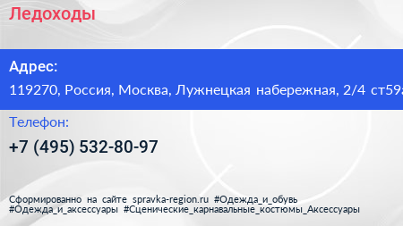 Ледоходы по адресу 119270, Россия, Москва, Лужнецкая набережная, 2/4 ст59а в дальнейшем Организация, размещена в следующих категориях: