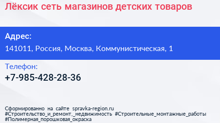 Лёксик, сеть магазинов детских товаров по адресу 141011, Россия, Москва, Коммунистическая, 1 в дальнейшем Организация, размещена в следующих категориях: