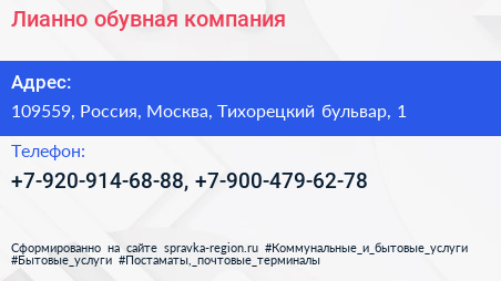 Лианно, обувная компания по адресу 109559, Россия, Москва, Тихорецкий бульвар, 1 в дальнейшем Организация, размещена в следующих категориях: