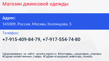 Магазин джинсовой одежды по адресу 141009, Россия, Москва, Колонцова, 5 в дальнейшем Организация, размещена в следующих категориях: