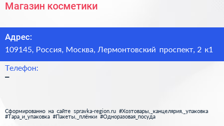 Магазин косметики по адресу 109145, Россия, Москва, Лермонтовский проспект, 2 к1 в дальнейшем Организация, размещена в следующих категориях: