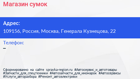 Магазин сумок по адресу 109156, Россия, Москва, Генерала Кузнецова, 22 в дальнейшем Организация, размещена в следующих категориях:
