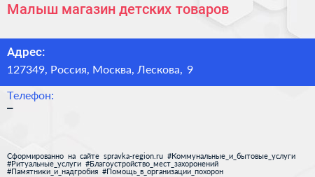 Малыш, магазин детских товаров по адресу 127349, Россия, Москва, Лескова, 9 в дальнейшем Организация, размещена в следующих категориях: