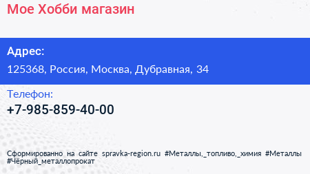 Мое Хобби, магазин по адресу 125368, Россия, Москва, Дубравная, 34 в дальнейшем Организация, размещена в следующих категориях: