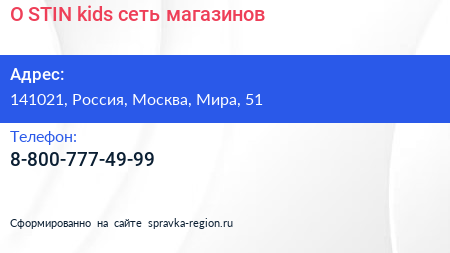 O`STIN kids, сеть магазинов по адресу 141021, Россия, Москва, Мира, 51 в дальнейшем Организация, размещена в следующих категориях: