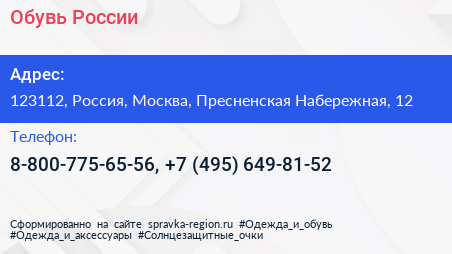 Обувь России по адресу 123112, Россия, Москва, Пресненская Набережная, 12 в дальнейшем Организация, размещена в следующих категориях: