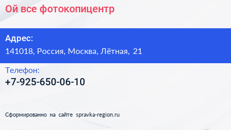 Ой, все, фотокопицентр по адресу 141018, Россия, Москва, Лётная, 21 в дальнейшем Организация, размещена в следующих категориях: