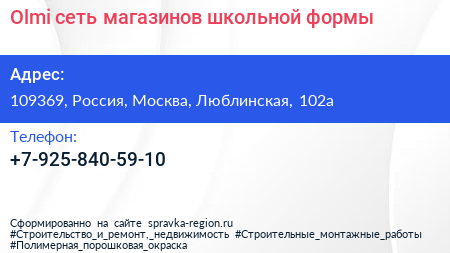 Olmi, сеть магазинов школьной формы по адресу 109369, Россия, Москва, Люблинская, 102а в дальнейшем Организация, размещена в следующих категориях: