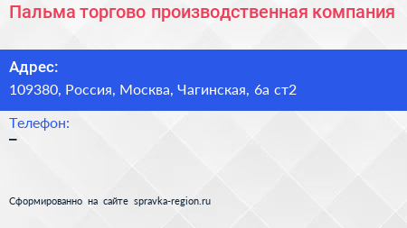 Пальма, торгово-производственная компания по адресу 109380, Россия, Москва, Чагинская, 6а ст2 в дальнейшем Организация, размещена в следующих категориях: