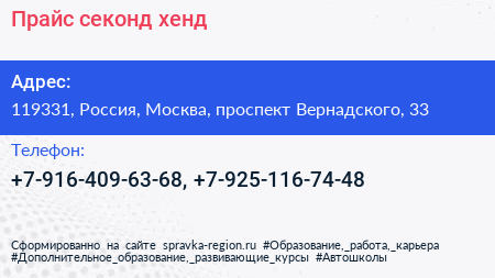 Прайс, секонд-хенд по адресу 119331, Россия, Москва, проспект Вернадского, 33 в дальнейшем Организация, размещена в следующих категориях:
