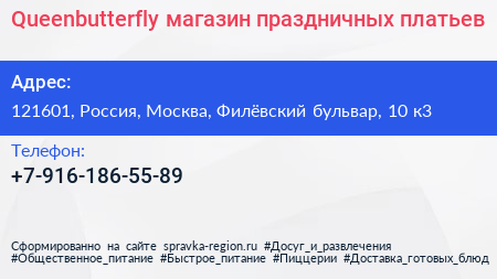Queenbutterfly, магазин праздничных платьев по адресу 121601, Россия, Москва, Филёвский бульвар, 10 к3 в дальнейшем Организация, размещена в следующих категориях: