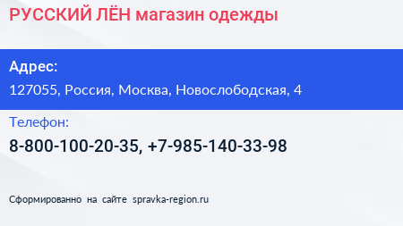 РУССКИЙ ЛЁН, магазин одежды по адресу 127055, Россия, Москва, Новослободская, 4 в дальнейшем Организация, размещена в следующих категориях: