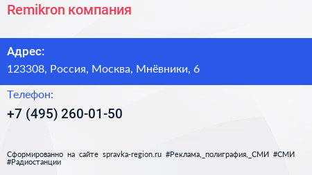 Remikron, компания по адресу 123308, Россия, Москва, Мнёвники, 6 в дальнейшем Организация, размещена в следующих категориях: