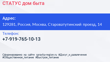 СТАТУС, дом быта по адресу 129281, Россия, Москва, Староватутинский проезд, 14 в дальнейшем Организация, размещена в следующих категориях: