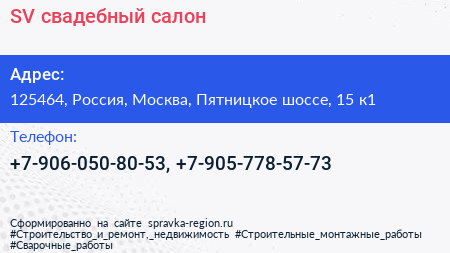 SV, свадебный салон по адресу 125464, Россия, Москва, Пятницкое шоссе, 15 к1 в дальнейшем Организация, размещена в следующих категориях: