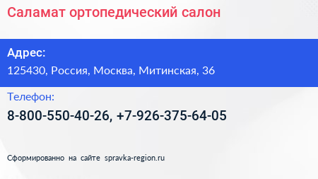 Саламат, ортопедический салон по адресу 125430, Россия, Москва, Митинская, 36 в дальнейшем Организация, размещена в следующих категориях: