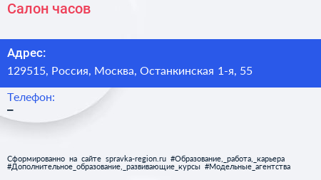 Салон часов по адресу 129515, Россия, Москва, Останкинская 1-я, 55 в дальнейшем Организация, размещена в следующих категориях: