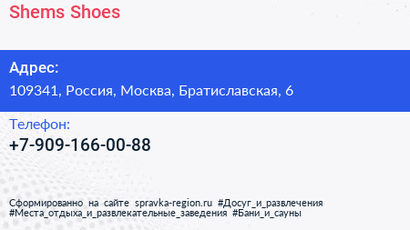 Shems Shoes по адресу 109341, Россия, Москва, Братиславская, 6 в дальнейшем Организация, размещена в следующих категориях:
