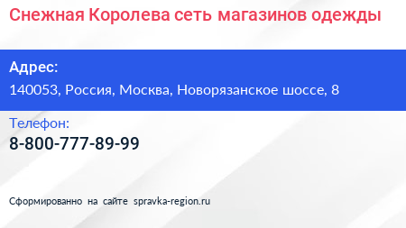 Снежная Королева, сеть магазинов одежды по адресу 140053, Россия, Москва, Новорязанское шоссе, 8 в дальнейшем Организация, размещена в следующих категориях: