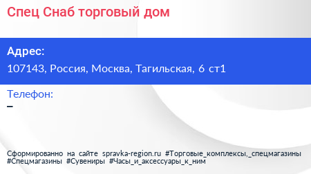 Спец-Снаб, торговый дом по адресу 107143, Россия, Москва, Тагильская, 6 ст1 в дальнейшем Организация, размещена в следующих категориях: