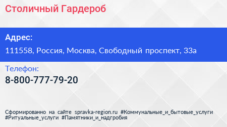 Столичный Гардероб по адресу 111558, Россия, Москва, Свободный проспект, 33а в дальнейшем Организация, размещена в следующих категориях: