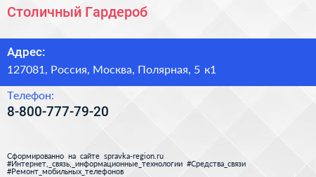Столичный Гардероб по адресу 127081, Россия, Москва, Полярная, 5 к1 в дальнейшем Организация, размещена в следующих категориях: