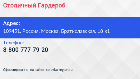 Столичный Гардероб по адресу 109451, Россия, Москва, Братиславская, 18 к1 в дальнейшем Организация, размещена в следующих категориях: