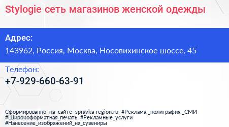 Stylogie, сеть магазинов женской одежды по адресу 143962, Россия, Москва, Носовихинское шоссе, 45 в дальнейшем Организация, размещена в следующих категориях: