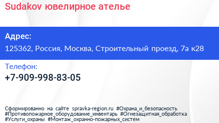 Sudakov, ювелирное ателье по адресу 125362, Россия, Москва, Строительный проезд, 7а к28 в дальнейшем Организация, размещена в следующих категориях: