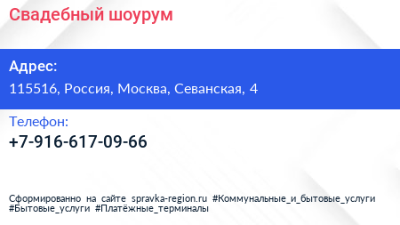 Свадебный шоурум по адресу 115516, Россия, Москва, Севанская, 4 в дальнейшем Организация, размещена в следующих категориях: