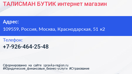 ТАЛИСМАН-БУТИК, интернет-магазин по адресу 109559, Россия, Москва, Краснодарская, 51 к2 в дальнейшем Организация, размещена в следующих категориях: