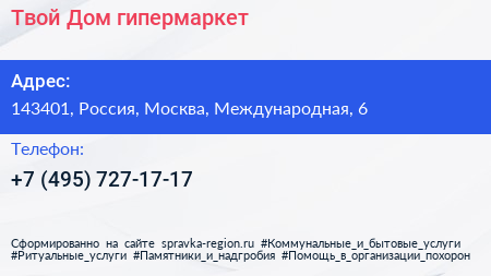 Твой Дом, гипермаркет по адресу 143401, Россия, Москва, Международная, 6 в дальнейшем Организация, размещена в следующих категориях: