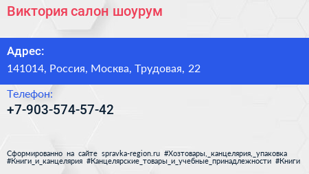 Виктория, салон-шоурум по адресу 141014, Россия, Москва, Трудовая, 22 в дальнейшем Организация, размещена в следующих категориях: