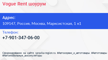 Vogue Rent, шоурум по адресу 109147, Россия, Москва, Марксистская, 1 к1 в дальнейшем Организация, размещена в следующих категориях: