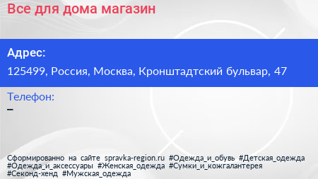Все для дома, магазин по адресу 125499, Россия, Москва, Кронштадтский бульвар, 47 в дальнейшем Организация, размещена в следующих категориях: