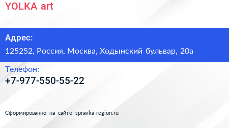 YOLKA art по адресу 125252, Россия, Москва, Ходынский бульвар, 20а в дальнейшем Организация, размещена в следующих категориях: