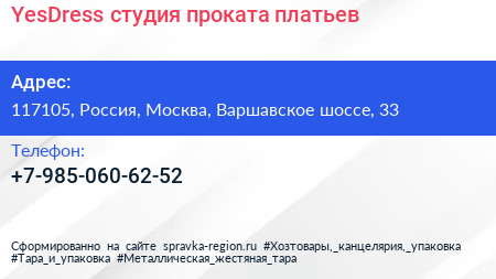 YesDress, студия проката платьев по адресу 117105, Россия, Москва, Варшавское шоссе, 33 в дальнейшем Организация, размещена в следующих категориях:
