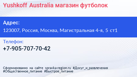 Yushkoff Australia, магазин футболок по адресу 123007, Россия, Москва, Магистральная 4-я, 5 ст1 в дальнейшем Организация, размещена в следующих категориях: