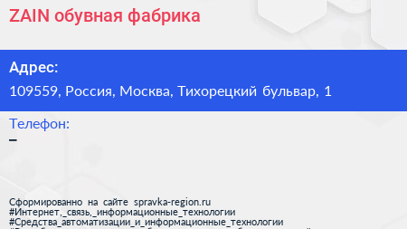 ZAIN, обувная фабрика по адресу 109559, Россия, Москва, Тихорецкий бульвар, 1 в дальнейшем Организация, размещена в следующих категориях: