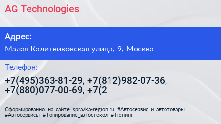 AG-Technologies по адресу Малая Калитниковская улица, 9, Москва в дальнейшем Организация, размещена в следующих категориях: