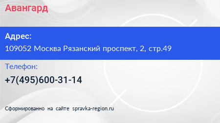 Авангард по адресу 109052 Москва Рязанский проспект, 2, стр.49 в дальнейшем Организация, размещена в следующих категориях: