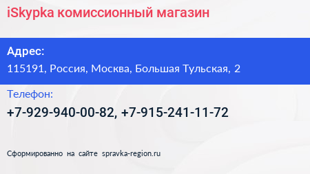 iSkypka, комиссионный магазин по адресу 115191, Россия, Москва, Большая Тульская, 2 в дальнейшем Организация, размещена в следующих категориях: