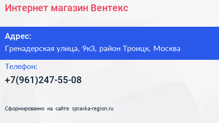Интернет-магазин Вентекс по адресу Гренадерская улица, 9к3, район Троицк, Москва в дальнейшем Организация, размещена в следующих категориях: