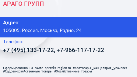 АРАГО ГРУПП по адресу 105005, Россия, Москва, Радио, 24 в дальнейшем Организация, размещена в следующих категориях: